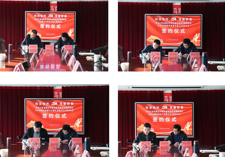 为认真贯彻落实党的十九届六中全会精神,创新基层党建工作载体,提高基层党建工作水平,进一步巩固学习实践活动成果。12月22日下午,江苏省锡山中等专业学校党总支与多家企业的党组织开展“校企合作 党建联盟”签约仪式。来自无锡锡州机械有限公司党委、同方计算机无锡党支部、中国农业银行无锡东北塘支行党支部、无锡国产麻豆影院在线观看电气有限公司党支部等党组织领导参加了本次仪式。